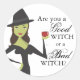 Uma bruxa verde adorável quer saber se você é uma boa bruxa ou uma bruxa má neste adesivo divertido - excelente para festas de Halloween ou qualquer outra celebração bruxa que você possa estar tendo!
