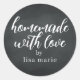 Adesivo rústico e moderno feito à mão com amor personalizado apresenta caligrafia manuscrita estilosa em um fundo de quadro negro. Perfeito para todos os seus presentes caseiros! Basta adicionar o seu nome ao rótulo. Exclusivamente projetado para si pelo Happy Dolphin Studio!