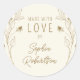 Feito com Amor Linha Arte Personalizada Desenho Floral Dourado em Creme Adesivo Redondo Clássico Rótulo de Produto... Um adesivo redondo dourado e creme elegante para seus presentes artesanais, alimentos assados em casa ou produtos caseiros à venda. Desenhos de flores em linha arte rodeiam o texto que diz "Feito com Amor por" seguido pelo seu nome em tipografia de letra cursiva da moda. Você pode facilmente alterar o nome e todo o restante do texto no modelo de personalização.
