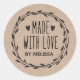 Um adesivo personalizado "feito com amor" em um fundo cor de kraft cercado por uma coroa de louros e corações. Faça-o seu adicionando seu próprio nome. Um bonito toque final para todos os presentes feitos à mão. Projetado para você pelo Blackberry Boulevard.