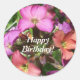 Uma folha de autocolantes florais com uma fotografia de uma flor de parede perene denominada "Constant Cheer" e Feliz Aniversário em branco no centro. Veja também botões, crachás e teclas com o mesmo design.