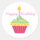 Adesivo Redondo Feliz Aniversário Amarelo Verde e Cupcake Rosa