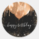 Um fundo preto chic. Decorado com pingos de brilho de ouro escuro, aparência de pingar tinta, poeira brilhante e balões. Com o texto: feliz aniversário escrito com um moderno estilo escrito à mão com traços.