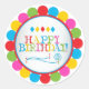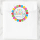 Círculo com círculos coloridos à sua volta em vermelho, azul, verde, amarelo e rosa. "Parabéns" no centro