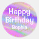 Um colorido, personalizado, adesivo clássico redondo Feliz Aniversário com um fundo de cor unicórnio arco-íris, brilhos dourados confetti e escrevendo branco ousado. Você pode adicionar facilmente o nome de sua escolha e alterar a cor e a fonte do nome usando a opção personalizar!
