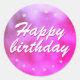 Febre branca, rosa, de folha metálica, gira de aniversário feliz. A design tem estrelas sobre um fundo metálico rosa e roxo.