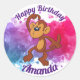 Este adesivo pode ser personalizado e é super fofo! Ele tem um macaco-desenho no centro e um fundo rosa, roxo e azul.