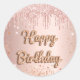 Um adesivo para uma festa de aniversário giro e glamourosa. Um fundo metálico rosa dourado falso com um rosa dourado falso elegante e pingos cor-de-rosa, pintura pingada. O texto: Feliz Aniversário é escrito com uma fonte de estilo balão de ouro.