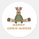 Um alce em botas de caminhada e um suéter verde e texto que diz "Feliz Chris-Moose" aparece nesses cartões de cartões de natal, botões, ímãs, sacos de tote, T-shirts e muito mais.