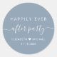Um adesivo azul empoeirado para seus convites de festas de recepção de casamento, favores e correspondência com "Feliz Festa Nunca Depois" em uma mistura de simples tipografia branca moderna e uma elegante escrita branca com baloiços, seus primeiros nomes se juntaram por um coração e sua data de recepção.