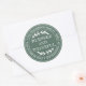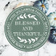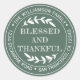 Adesivo de endereço de remetente redondo Feliz Dia de Ação de Graças com seu nome e endereço em tipografia branca estilosa apresenta o texto ABENÇOADO E GRATO em tipografia manuscrita com um toque estiloso de folhagem rústica em um fundo verde. Também ótimo para um agradecimento de negócios aos clientes! Basta adicionar o nome e endereço da sua empresa ou site. Exclusivamente projetado para você pelo Happy Dolphin Studio.