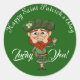 Sorte sua, adesivo Lucky Leprechaun para a etiqueta de São Patrick/suprimentos de artesanato. Perfeito para o Partido Irlandês da Cerveja e as celebrações irlandesas. A ilustração apresenta um fundo verde-shamrock e um Leprechaun/Elf travesso. O TEXT usa caligrafia moderna. O TEXT pode ser personalizado com sua escolha de palavras e script.