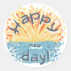 Um sol alegre sobe ao longo de um horizonte azul com raios coloridos espalhando-se para fora, acompanhado pelo texto "feliz novo dia!" em letra lúdica. uma vibrante e otimista peça de arte.