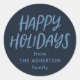 Este simples adesivo de férias é o toque perfeito para seus presentes ou favores. Ele apresenta as palavras Felizes Feriados em uma fonte de estilo manuscrito em azul-claro em um fundo azul-marinho junto com um "de" personalizado. Criado por Lea Delaveris Design, este adesivo de feriado único coordena-se perfeitamente com a coleção de esperança e alegria de amor pela paz que inclui cartões de natal, plástico e muito mais. Encontre cores adicionais na coleção também.