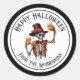 Dê alguns favoritos para festas adoráveis aos convidados numa festa anual de fantasia de Halloween, ou qualquer evento com este adesivo simples e divertido. Um simples aspecto preto e branco, que tem uma simples tipografia vírgula. Um esqueleto de bebendo com chapéu de cima e colete laranja lhe dá algum caráter. Descrito com círculos pretos. Bebendo pirata personalizado Skeleton de festa do Dia das Bruxas Feliz Adesivo redondo clássico