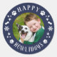 Adesivos de feriado apresentam uma foto circular do seu cachorro favorito com uma moldura azul-marinho festiva "Feliz Howlidays" que inclui texto moderno branco, impressões de patas, estrelas, flocos de neve e destaques de osso de cachorro. A cor de fundo azul-marinho pode ser personalizada. Esses adesivos funcionam bem como selos de envelope de cartão de Natal!
