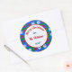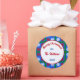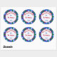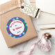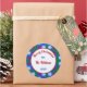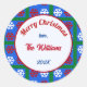 Personalize seus próprios adesivos de Natal com este adorável modelo com flocos de neve vermelhos e brancos em um quadrado azul, todos fechados em um fundo verde. O nome da família e o ano são editáveis.
