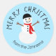 Estes adesivos apresentam uma ilustração adorável de um boneco de neve vestindo um chapéu de inverno e cachecol sobre um fundo azul claro, juntamente com um texto personalizável que diz Feliz Natal.