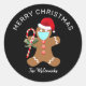 Adicione um divertido cumprimento de Feliz Natal aos seus cartões ou presentes com este Adesivo Redondo Clássico Feliz Natal Homem de Biscoito Santa Personalizado. Ele é projetado com um adorável homem de biscoito usando máscara facial e chapéu vermelho de Papai Noel e ele está segurando um bastão de doce com um laço verde. O texto é "Feliz Natal".