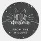 Um adesivo de presente de Natal redondo com Meowy Christmas escrito sobre fundo de quadro negro, decorado com orelhas de gato e bigode. Adicione seus nomes!