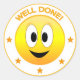 Ideal como um adesivo de recompensa em escolas, clubes e até em casa. Um rosto grande redondo feliz com "Bem Feito!" em texto amarelo curvo sobre o rosto feliz. Pequenas estrelas amarelas ao redor do fundo da face.