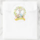 Primavera de boas-vindas com uma ilustração típica de aquarela de um coelho vestido de bolinhas azul segurando uma galinha de jardim. Uma coroa de tulipas de primavera rodeia o coelho com uma faixa de fita amarela desejando um Felz pascoa. Use este adesivo em favoritos para festas, pacotes de presentes, decorações de mesa e muito mais.