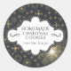 Etiquetas elegantes, pretas e de cozinha dourada para assar - Preto com flocos de neve metálicos dourados. No centro há um emblema elegante com bordas e curlicudos de carvão. Lê 'Cookies de Natal caseiros' em letras elegantes, que podem ser mudadas para qualquer mercadoria cozida ou comida que seja sua especialidade de feriado. Nome personalizado por baixo. Clique na opção Personalizar para alterar as cores do texto, o tamanho e os estilos de fonte. Etiquetas de Natal de ouro festivo para presentes de comida de férias como receitas num frasco, vendas de assares de férias, festa de troca de biscoitos e outras festividades de férias. Não só para o Natal, mas para o inverno, os autocolantes de panificação durante toda a época de inverno.