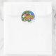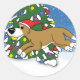 Este adorável cão marrom e branco está dando um grande salto sobre um galho de árvore de Natal. Ele está vestindo um boné de Papai noel vermelho e carregando um ornamento amarelo redondo em sua boca. O fundo é azul com neve caindo. Presente único de bola de Natal para donos de animais de estimação. Na parte inferior lê-se: "Piscando pela neve..."