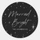 Os autocolantes modernos de férias com "Casado e Brilho", exibidos em um script com letra manuscrita rodeado por uma borda de estrelas brancas contra um fundo preto. Personalize os adesivos casados e brilhantes, adicionando seus nomes abaixo. Os adesivos funcionam como excelentes de envelope, para selar bolsas favoritas e muito mais!