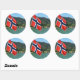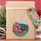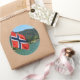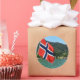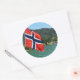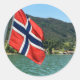 Cartaz fotográfico redondo com a bandeira norueguesa num ferry entre Solvorn e Urnes num fiorde na Noruega.
