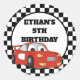 Etiqueta de festa de aniversário personalizada com um carro de raça vermelha sobre fundo branco e preto.