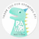 Um bom adesivo de favor para a festa de aniversário do tema do dinossauro do seu filho! Ilustração de um dinossauro verde vestindo um chapéu de festa no meio com uma fonte tipográfica em seu corpo que diz "RAWR!" Personalize este produto adicionando o nome do seu filho na parte inferior. O texto acima diz: "Obrigado por ter passado!" Excelente para a festa de aniversário de um menino.