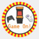 Diversão, design perfeito para o seu jogo de vídeo ou festa de aniversário tematizada de 'arcade'. Design apresenta um plano de fundo de explosão solar amarelo e vermelho alaranjado. No centro há um círculo branco com caimento preto. No meio do círculo está um console de jogos retrô-arcade e dois controladores de console de jogos diferentes. Abaixo do jogo de jogos e os controladores de jogos estão textos na fonte da matriz de pontos laranja que diz Game On! Este adesivo é o selo perfeito para seus Convites de festas de aniversários coordenadores do Console de Vídeo da Arcade Retroativa!