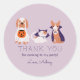 O tema do Dia das Bruxas bonitinho favorece o adesivo para crianças com ilustração adorável de dois cachorros e um gato com fantasias (morcego, fantasma e vampiro) em um fundo roxo. Personalize este produto adicionando o nome da criança. Perfeito para a festa de aniversário de uma garota no outono. O texto diz "Obrigado por vir à minha festa!"