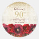 Estes elegantes adesivos de festa de aniversário de 90 floral apresentam rosas vermelhas pintadas em aquarela com um nome e data para personalizar em uma caligrafia moderna em um fundo de ouro shimmer com falso brilho dourado. Desenhada por Susan Coffey.