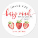 O adesivo de festa de aniversário favorito da garota de framboesa com ilustração de cor d'água das frutas de morango. O texto diz "obrigado-te a BERRY por vir ao meu partido."
