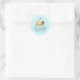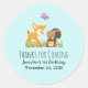 Obrigado de festas que você cola com uma ilustração fofinha apresentando um veado bebê e um pequeno esquilo segurando uma bolota e uma borboleta voando sobre suas cabeças. Estas adoráveis criaturas de floresta em pé sobre uma grama com alguns cogumelos brancos perto de seus pés. Fundo azul claro.
