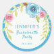 Este adesivo de festa de despedida de solteira apresenta um buquê floral boho elegante com acentos de azul e rosa. Folhagem botânica em aquarela suave é complementada com pontos brancos ao fundo. Feliz e alegre; esses adesivos para festa de despedida de solteira são perfeitos para a primavera ou verão, ou um fim de semana em clima mais quente.