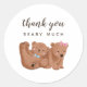 O gênero do tema do urso revela uma festa com ilustração de filhotes de meninas e meninos. O texto diz: "obrigado você beira muito."