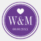 O monograma roxo e branco favorece os adesivos. Coração bonito com nomes monográficos de noiva e noiva e data do casamento. Obrigado personalizado que você cola ou sela de envelopes/sela para cartões salve a data e convites. Tipografia de na moda elegante para noiva e noivas. Design / impressão rico rubricado por chic. Cor de fundo personalizável. Design do tema do amor romântico. Também é bom para chá de panela, noivado, solteira ou festa de aniversário.