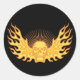 Crânio de Badass com asas chamas de haste quente e raios justos de luz. Sombras de ouro, t-shirts, bonés, autocolantes, presentes.