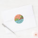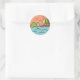 A flat-design, vector-style illustration of a serene landscape enclosed in a circular border.