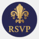 Fleur-de-lis RSVP. Dourado em azul escuro. A cor de fundo pode ser alterada. A maioria das imagens da série "folha de ouro" tem uma área de fundo generosa, portanto, se você estiver personalizando com texto ou imagem, você poderá ajustar o enquadramento (recorte) para se adequar a muitas ideias.