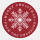 Coloque seus cartões de Natal e presentes com esses adesivos personalizados doces, com um fundo vermelho de férias com um floco de neve branco no centro, cercado por sua saudação e nome personalizados. Mostrado com "Feliz Natal".