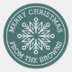 Embalagem de presente de inverno ou etiquetas de cartão de Natal com um floco de neve branco e moderno. Nome personalizável e texto "Feliz Natal". Texto branco e floco de neve sobre fundo verde-pinho. Todas as cores são personalizáveis.