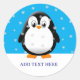 Um desenho bonito de pinguim preto e branco. Vinhetas de animais. Céu azul e flocos de neve no fundo. Editar texto para personalizar. Ideia de presente para crianças.