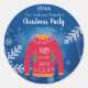 Um adesivo para uma época de férias divertida e festas de Natal, janta favores. Um fundo azul com grandes flocos brancos de neve, cristais. Decorado com um suéter de Natal vermelho, branco, laranja e verde feio. Personalize e adicione seu nome de família, ano e tipo de festa. O texto: Festa de Natal é escrita em branco com um moderno estilo escrito à mão. Cartas brancas.