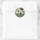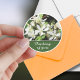 Nesta adesiva personalizada circular, simples e delicadas flores de rosa branca brotam em meio a um fundo de folhagem verde e galhos marrons. Eu amo a união desses três elementos para formar uma imagem atraente e bonita. Abaixo, uma área para uma frase curta ou nome atualmente lê "Pensando em você." Você pode alterar este texto se preferir algo diferente.