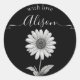 Um adesivo personalizável, simples e delicado, preto e branco, da flor Daisy. Personalize o texto, o tipo de fonte e as cores de sua preferência.