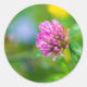 Uma vista de perto de uma flor de trevo rosa contra o fundo multicolorido liso de uma praça de verão. Cor roxa, verde, amarela e azul. O símbolo da boa vida, do conforto, da riqueza e da prosperidade